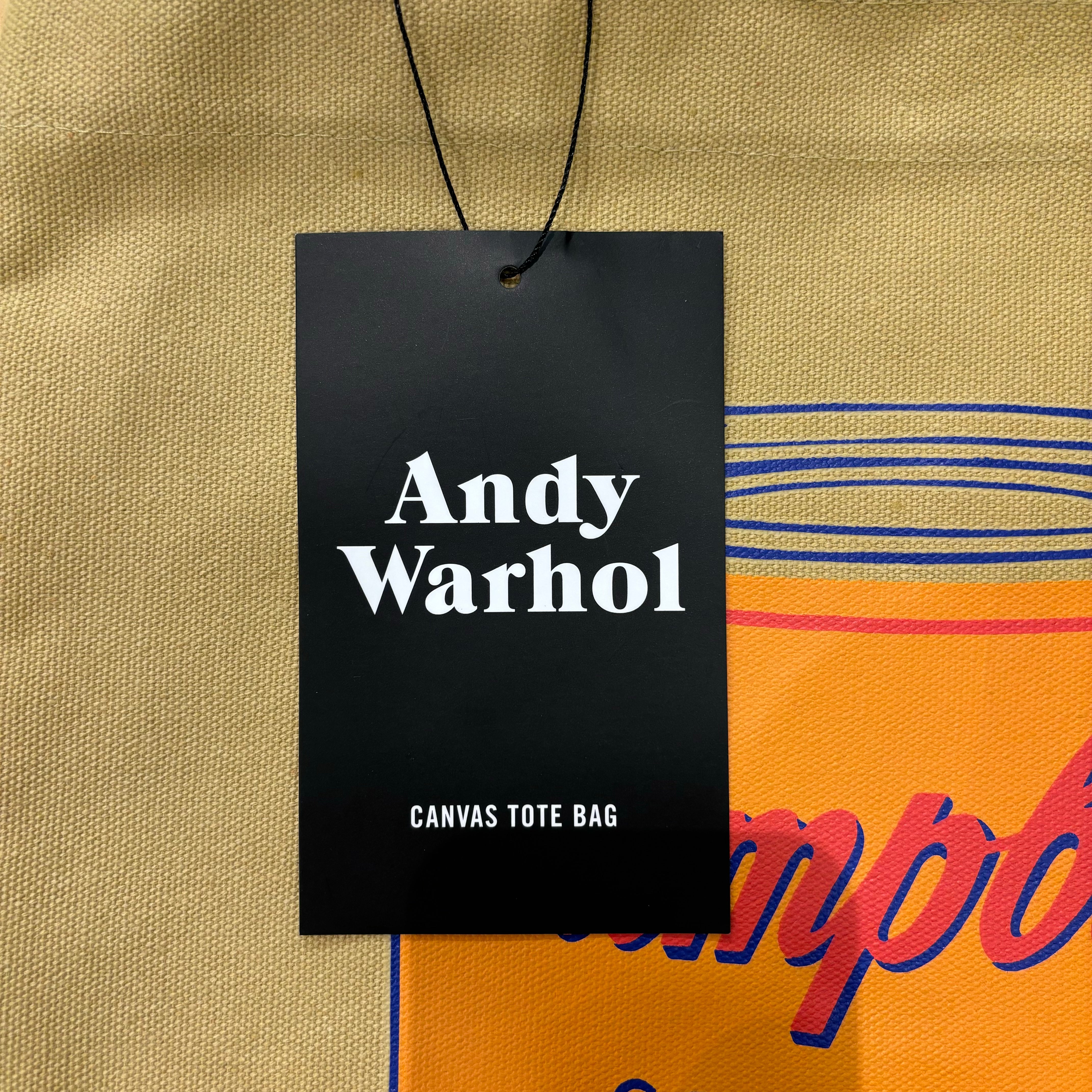 THIS ANDY WARHOL CAMPBELL'S SOUP TOTE BAG FEATURES HIS ICONIC CAMPBELL'S SOUP CAN ILLUSTRATION ON ONE SIDE AND DISTRESSED STAMPED SIGNATURE ON THE OTHER. COMES WITH THREE LIMITED EDITION PINS'BANANA, ANDY WARHOL SELF PORTRAIT, AND POPPIES WITH QUOTE "POP ART IS FOR EVERYONE." SECONDARY HANGTAG WITH FACSIMILE OF AN ANDY WARHOL ART STORE RECEIPT. HEAVY-GAUGE COTTON CANVAS