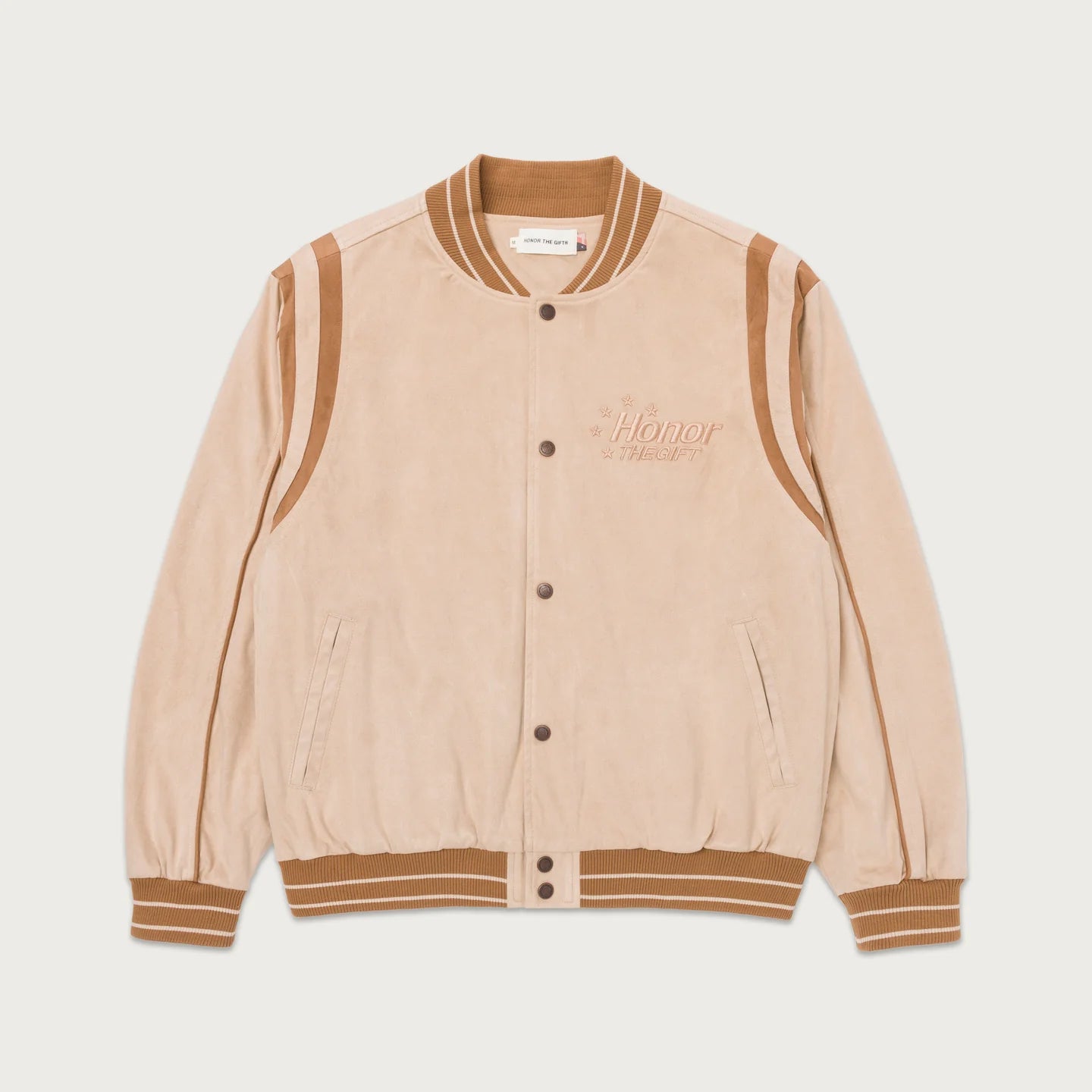 Peached Polyester Varsity, Custom Ribbing, Contrast Piping, Chenille Oil Head Back Graphic, 90% Polyester 10% Spandex